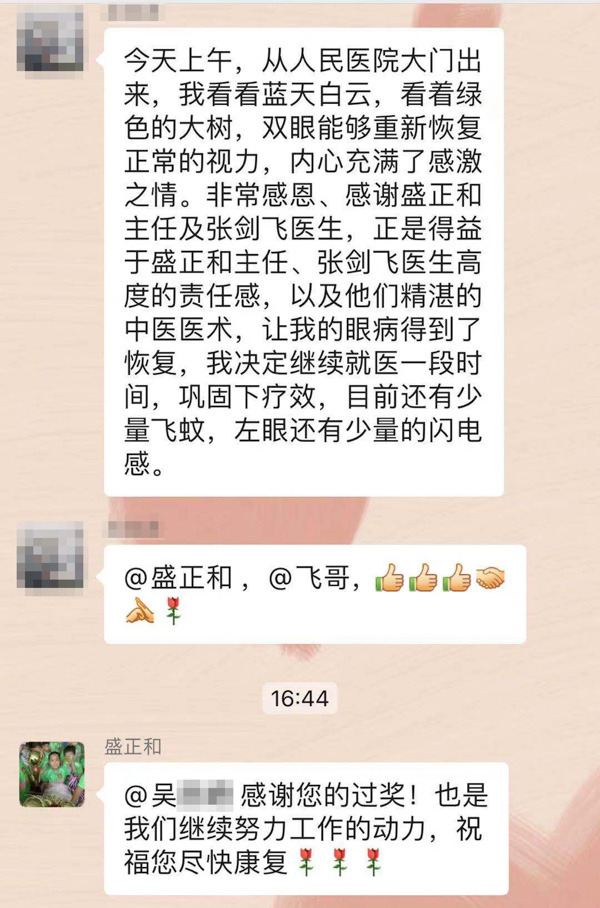 “感谢盛正和主任和张剑飞医生,他们的高度责任感和精湛医术让我的眼睛得到了恢复……”吴阿姨把自己这段时间治疗的感触发在了我院治未病中心的病友微信群里,看了她的反馈,给了很多病友治疗、改善眼疾的信心。