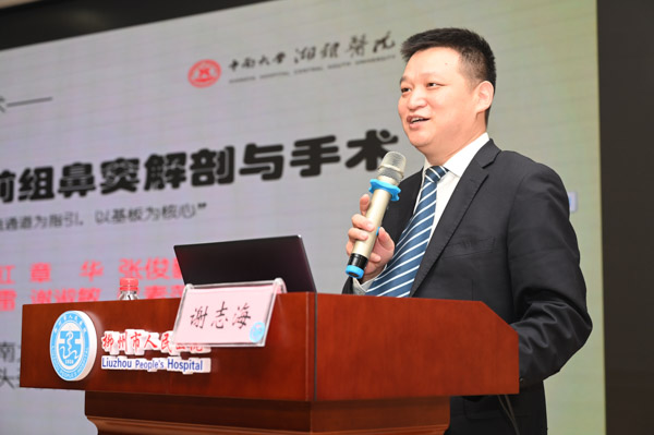 湘雅医院耳鼻咽喉头颈外科主任蒋卫红,副主任谢志海副教授带领的鼻颅底团队一行6人进行授课,旨在进一步推进外省市级医院耳鼻咽喉学科的发展,让湘雅的优质资源和先进技术更好地推广并传授于外省县市级医院。会上,教授团队对近10名耳鼻喉科研究生和来自南宁、河池、贵港、贺州、桂林、柳州等地医师提出的精准鼻内镜外科理论中基板和引流通道和临床中的疑难问题处理进行了现场解答和点评。