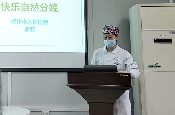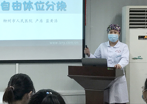 10月13日,在门诊三楼孕妇学校,助产士蓝黄浩向大家介绍了柳州市人民医院产房的团队和环境,展示了产房的优质护理项目:分娩镇痛、晚断脐、自由体位分娩、导乐分娩、母婴早接触等。着重讲解了什么是分娩的自由体位,自由体位分娩的好处和配合方法。