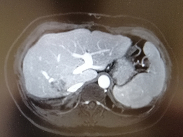 卢女士不幸罹患结肠癌,手术切除后再次发生肝内转移,经多程化疗后肿瘤明显缩小,但肿瘤靠近血管,手术切除风险大且费用较高。2020年10月28日下午,在肿瘤科主任鲁培博士的带领及李竟长副主任医师的积极协调下,肿瘤科介入团队郭旭飞副主任医师和石周主治医师经过反复讨论,并与病人深入沟通后,最终制定了肝转移瘤射频消融术的治疗方案。历时1小时,手术顺利完成,患者取得良好的治疗效果。