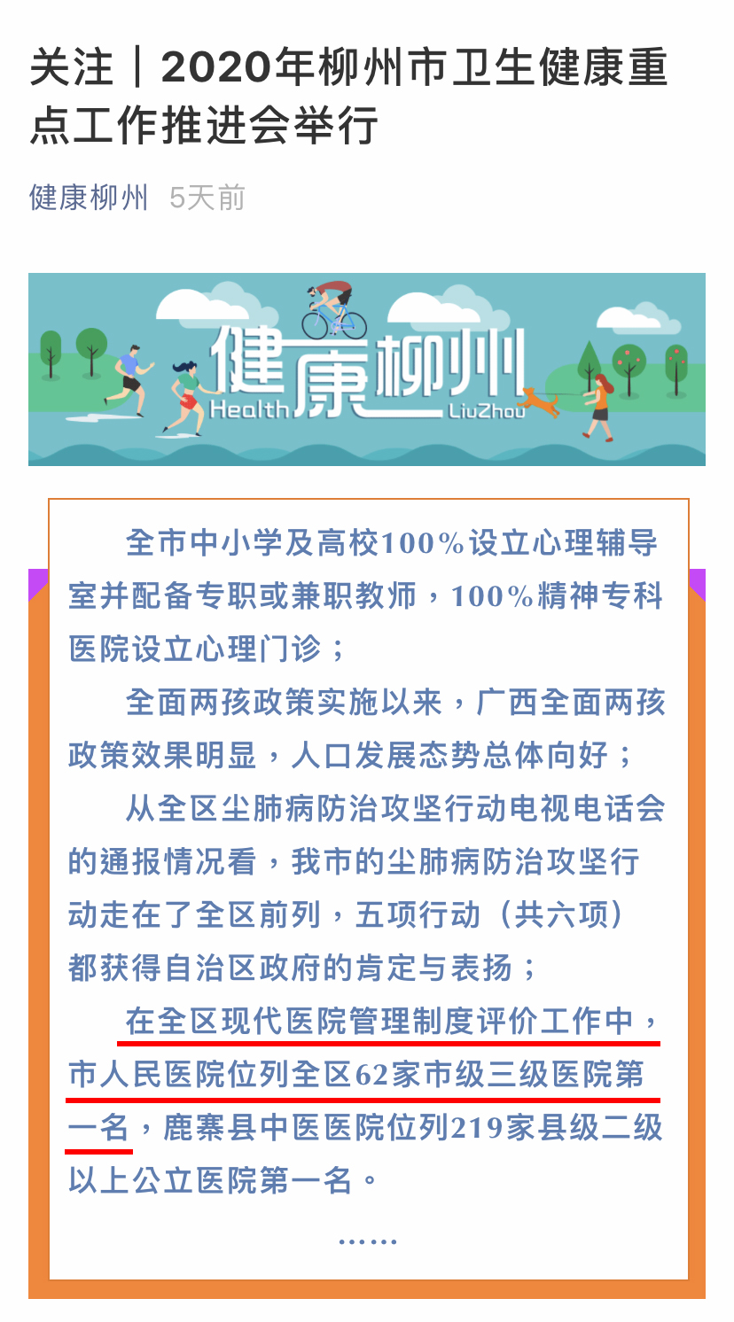 日前,柳州市卫生健康委《健康柳州》官宣:在全区现代医院管理制度评价工作中,柳州市人民医院位列全区62家市级三级医院第一名。这是柳人医人脚踏实地,奋勇拼搏,不断提升患者获得感和幸福感的真实写照,更是医院为保障全区百姓健康不懈努力的目标!