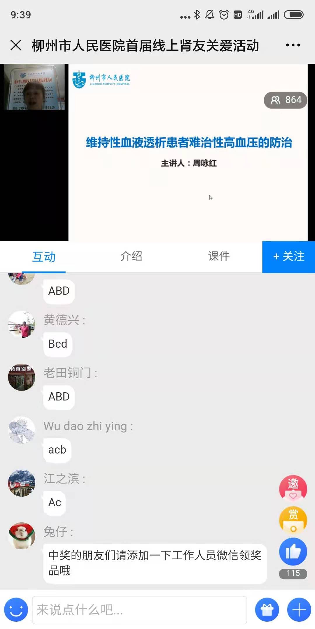 在会上,肾脏病内科/血透室主任李建飞,血透室医生周咏红,血透室护士长邓佳分别就《钙磷代谢异常的防治》、《维持性透析患者难治性高血压的防治》、《用心呵护您的“生命线”》等课题在直播间进行授课,并深入浅出,针对性强的给大家细致讲课、分享经验,主要想让手机屏幕前的广大肾友们学习到更多的肾脏疾病的防控专业知识,并针对存在问题进行线上有奖问答形式互动交流,增加活跃气氛,病友积极参与,患者们均表示受益匪浅。活动结束后,我们将会议直播内容设置回,方便患者及家属再次重温课程宣教精彩内容,巩固知识,加深印象。