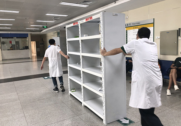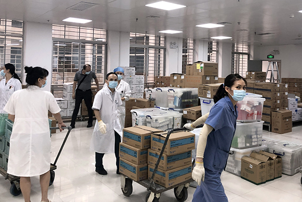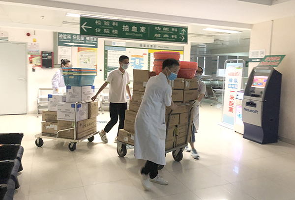 7月18日中午12点30分,在调配完住院病房最后一批药品后,药学部开始了搬迁和应急工作的准备。中午1点,大家主动放弃周末休息时间,甩开膀子积极投入到搬迁工程中来,将药品装箱、货架拆卸、冷柜运送……平板车、拉药车全都派上用场。新旧药房场地货架分布图清晰明朗,个人分工明确:打包、护送、上架、移货架,还有搬迁过程中住院病房及出院病人用药负责发放的协调工作,都在井然有序地进行着。面对1200多种药品,一丝不苟地打包、核对,每一箱药品类别清晰,按照药品货位号装箱打包,使得后期上架工作非常顺利,保证第二天住院病房正常用药。