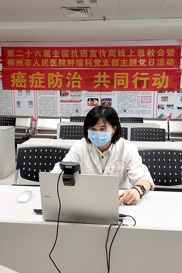 根据新冠肺炎疫情的防控形势的要求,2020年4月20日下午,柳州市人民医院肿瘤科专家团队在全国肿瘤防治宣传周,采用线上直播形式,向广大市民群众宣传肿瘤相关知识,传播肿瘤防治的方式方法。此次活动由陈日新副主任主持,汇聚了罗展雄副主任、朱州副主任、李竟长博士、于斌博士、卫青青副主任医师、周媛媛副主任医师、秦佳宁主治医师、郭旭飞副主任医师、石丰榕主治医师、陈露主管护师等实力专家。围绕科学抗癌,加强健康教育,远离不良生活习惯,就肺癌防治、头颈部放疗、乳腺癌防治、抗肿瘤药物不良反应及处理等相关知识进行了深入浅出的讲解。并对观众提出的“老年患者肺癌治疗”、“胶质瘤治疗方案选择”、“乳腺癌预防措施”等疑问进行线上解答。