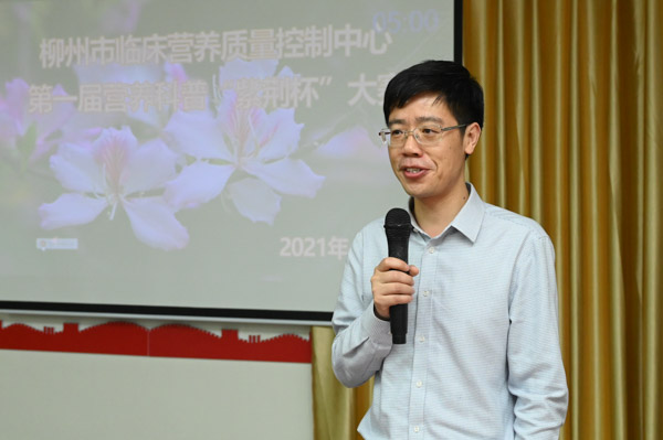 为贯彻落实《健康中国2030规划纲要》,深入实施《2017-2030年国民营养计划》,提高国民营养健康水平,4月24日,柳州市临床营养质控中心第一届 “紫荆杯”科普大赛在我院成功举办。我院副院长肖运平,广西临床营养质控中心主任张勇胜,副主任蒋志雄、韦少雪出席大赛。