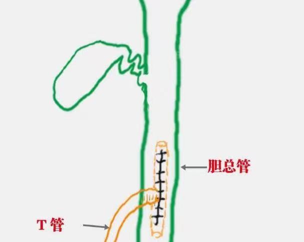 T管,顾名思义就是形状像字母”T”一样的管子,它是在胆管结石手术中,当胆总管被切口再缝合时需要放到胆总管里面的一根管子。T管一般有长、短两个臂,一个臂通向胆总管,一个臂通向肝总管,构成了字母T的那一横,字母T的那一竖是将胆汁直接引流出腹腔外,外接引流袋,那一横是流到肠道或者体外。