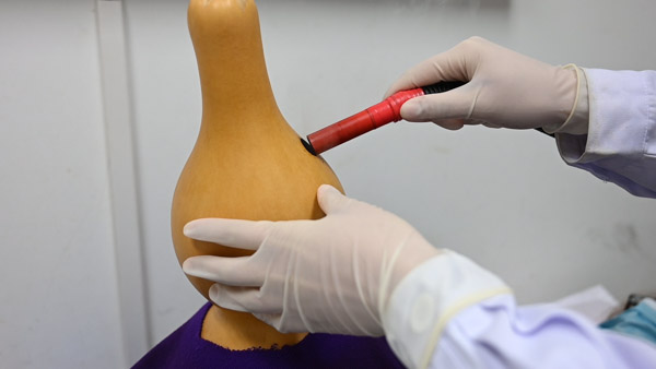 葫芦具有密闭性和容纳性两个特点,内置点燃的艾卷与之完美结合,温度恒定,施灸面积大,舒适度高。该疗法遵循“无烟不为灸”理念,避免了艾灰、艾烟的困扰,患者只闻艾香,少见灸烟。