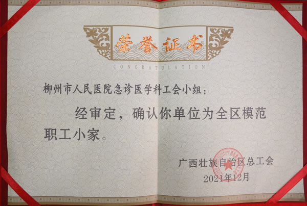 此次获评自治区“模范职工小家”,既是对柳州市人民医院急诊医学科工作的肯定和鞭策,也是对全院干部职工的激励和鼓舞。柳州市人民医院全体干部职工将以此为动力,向先进看齐,继续真诚服务、守护人民健康,不断增强全院职工的凝聚力和战斗力,为医院高质量发展贡献更大力量!