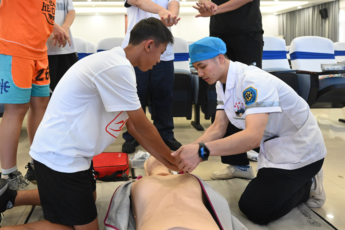 讲课结束后,医务人员现场演练心肺复苏操作流程,并邀请学生们轮流上台实操演练。在医务人员的指引下,学生们用人体模型体验了心肺复苏术,虽然保持正确的按压姿势非常费力,但学生们还是打起精神,用最严谨的姿势和态度进行着心肺复苏抢救模拟。短短一个下午,参训学生们解锁了新的急救技能,纷纷表示受益良多。
