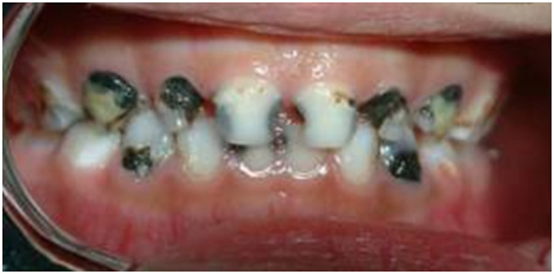 当看到明明的牙齿,接诊医师吓了一跳:患儿全口20颗牙齿,全部都烂了,有的牙齿周围牙龈还长有脓包!