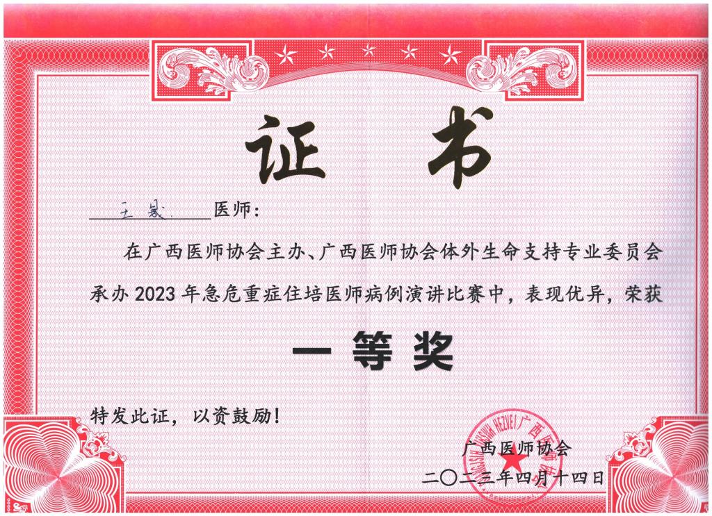 4月14日,由广西医师协会主办、广西医师协会体外生命支持专业委员会承办的广西医师协会体外生命支持专业委员会 2023 年学术年会在南宁举办,会上开展了全区急危重症住培医师病例演讲比赛,柳州市人民医院重症医学专业住培基地学员王晟医师力战全区各大医院参赛选手,以全场最高分勇夺第一名。